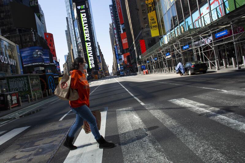 A woman crosses a road in New York City's Times Square, on April 6, 2020.