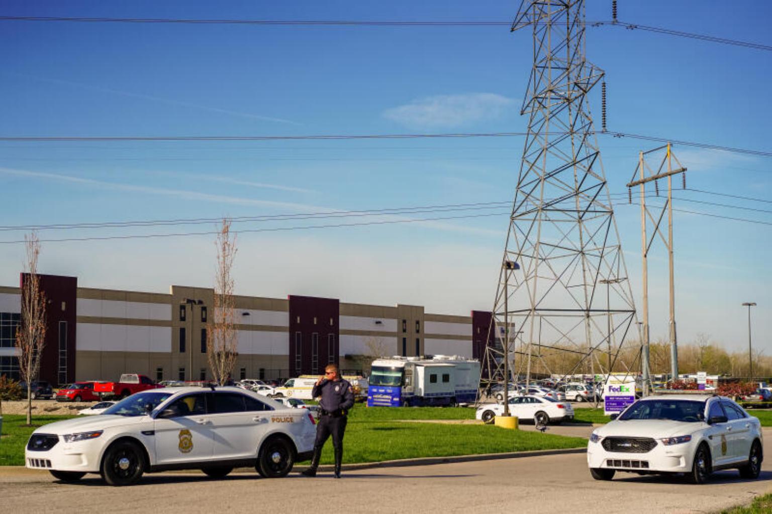 Indianapolis police secure the entrance to a FedEx warehouse on, April 16, 2021, following a mass shooting at the facility.
