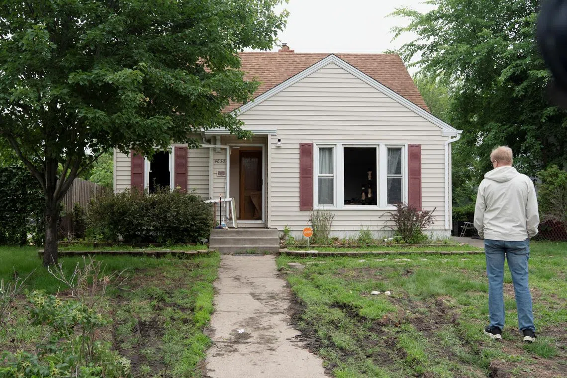 A neighbourhood resident inspects tire tracks from law enforcement vehicles in the front yard of a residence associated with 57-year-old Vance Luther Boelter.