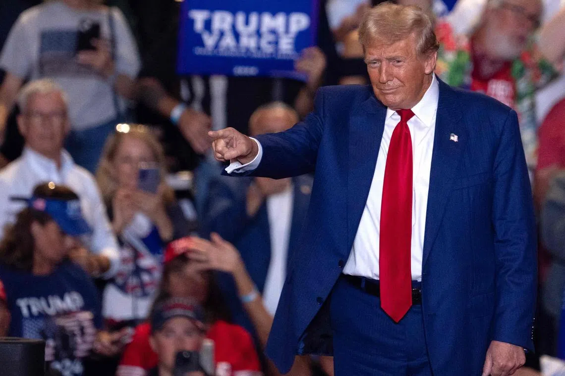 Donald Trump acknowledges the crowd during a campaign rally in Uniondale, New York, on Sept 18, 2024.