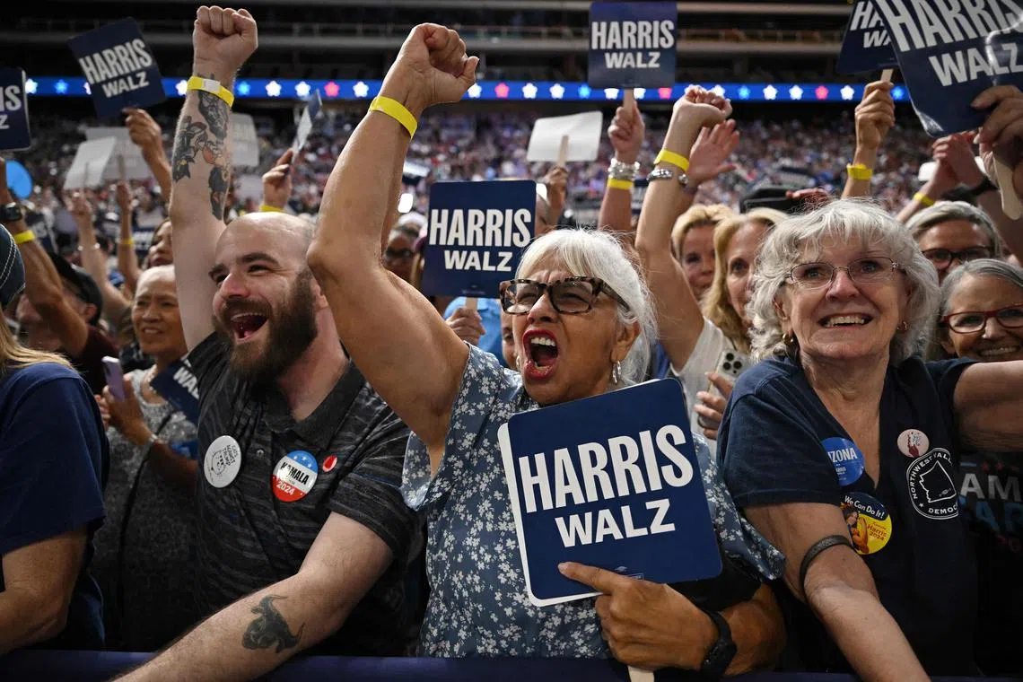 Supporters at a campaign event by US Vice-President and Democratic presidential candidate Kamala Harris and her running mate Tim Walz at Desert Diamond Arena in Glendale, Arizona, on Aug 9.