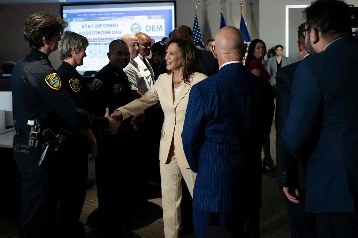Ms Harris greeting police officers in the US on July 24. Indian-Americans are more politically liberal in the American context, said an observer.