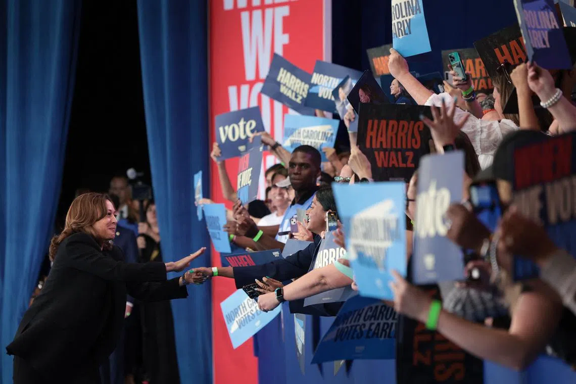 Democratic presidential nominee and US Vice-President Kamala Harris greets supporters at a campaign rally at the Walnut Creek Amphitheatre in Raleigh, North Carolina, on Oct 30.