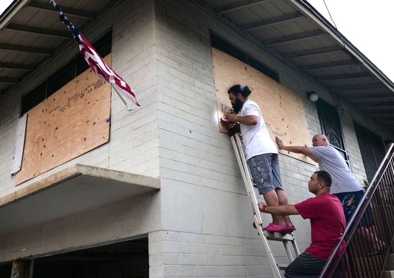 Residents board up the windows of their home in preparation for hurricane Douglas in Honolulu, Hawaii, on July 25, 2020.