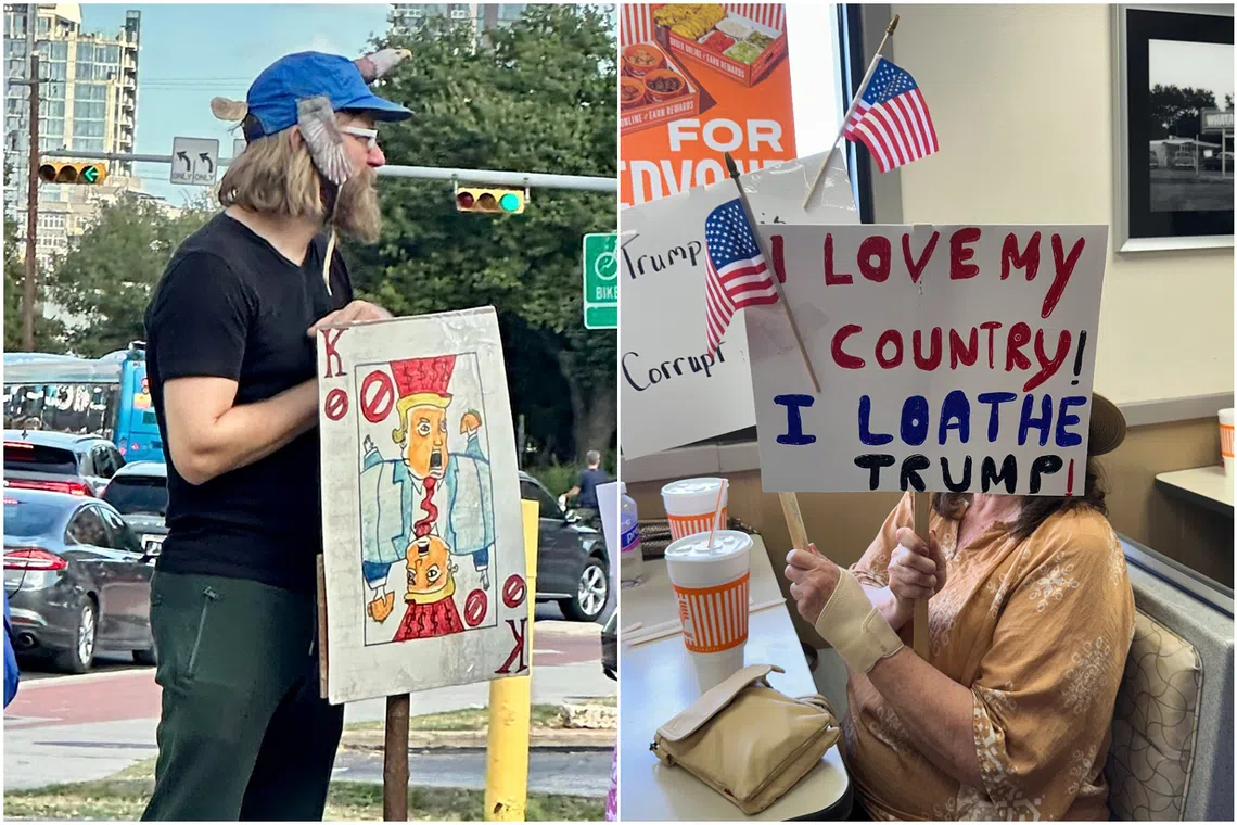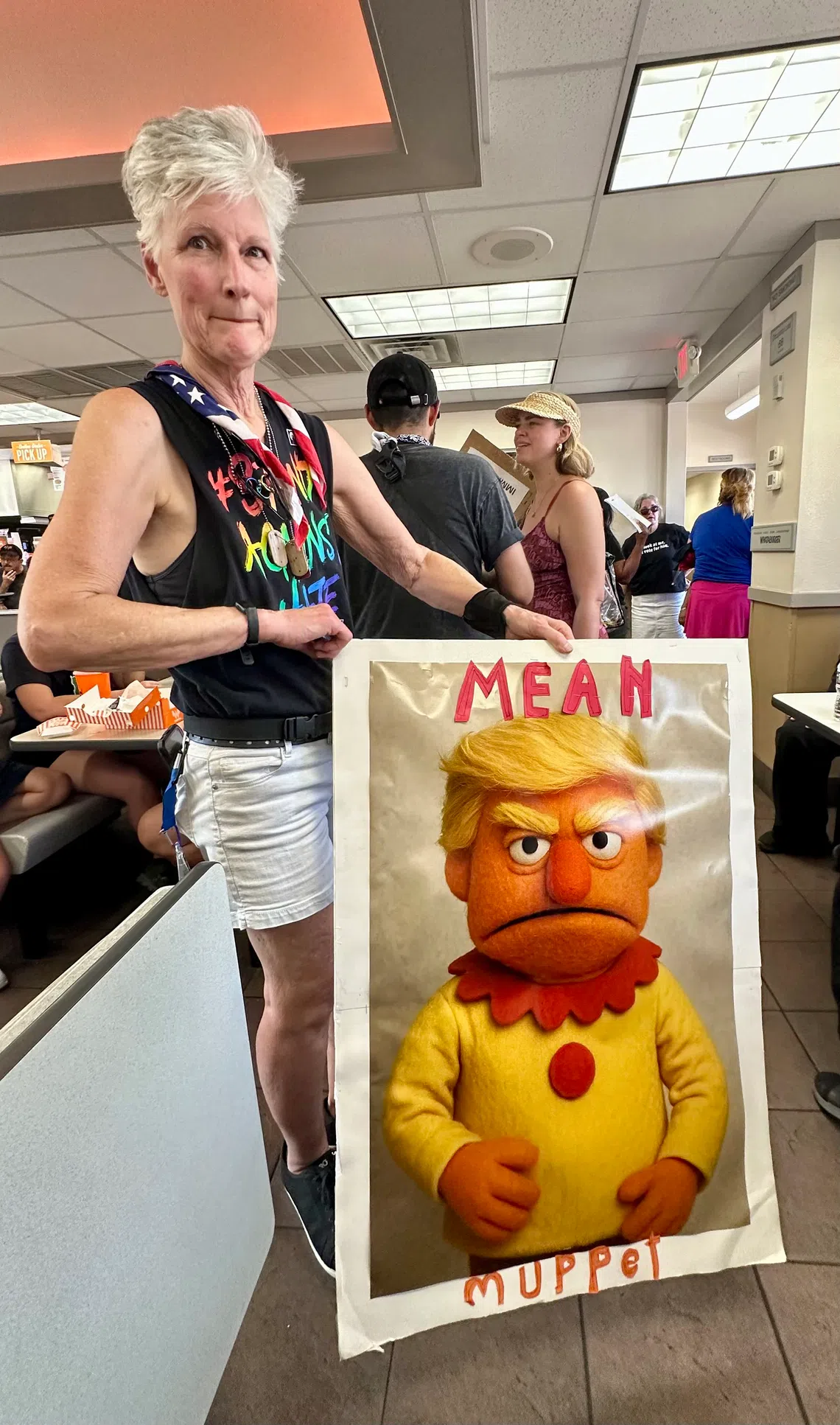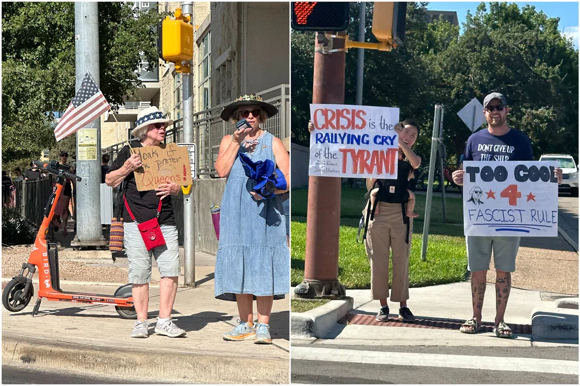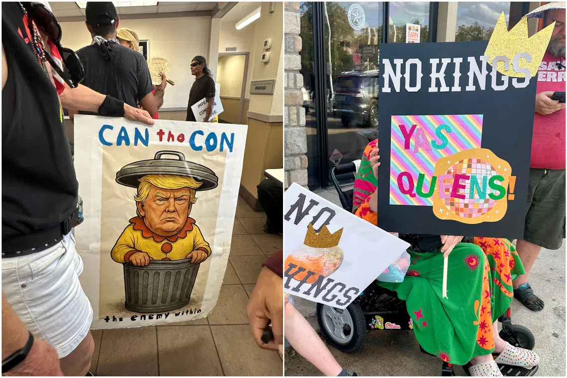 “The No-Kings message doesn’t resonate with me, but I understand what they’re trying to say. It’s a stand against dictators,” said Ms Kathleen Shaheen, a 71-year-old mental health worker who took a break from the march to cool off with a drink at a local burger store.