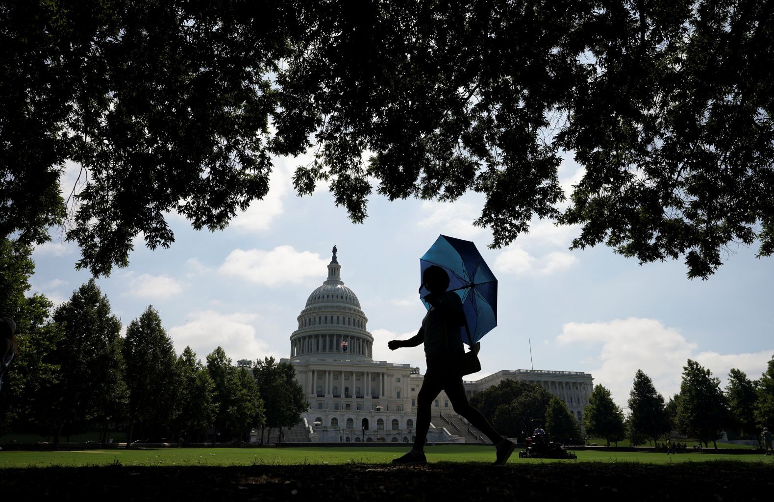 A woman holds an umbrella against the sun as she walks the grounds of the US Capitol in Washington.