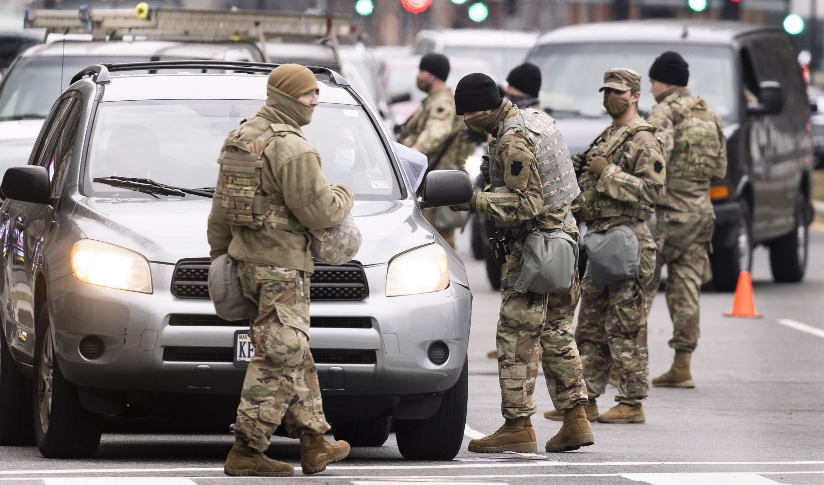 Armed National Guard troops help run a checkpoint in Washington DC, to secure the streets leading to the US Capitol building on Jan 15, 2021.