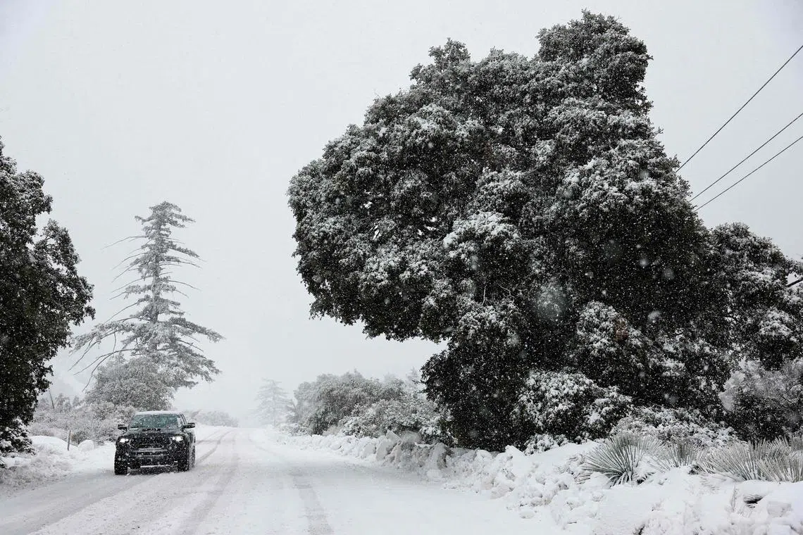 A vehicle drives through a snow storm in the San Gabriel Mountains in Mount Baldy, California, on Feb 24, 2023.
