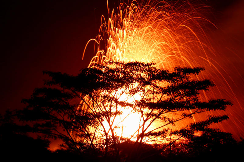 Lava erupts on the outskirts of Pahoa during ongoing eruptions of the Kilauea Volcano in Hawaii, on May 18, 2018.