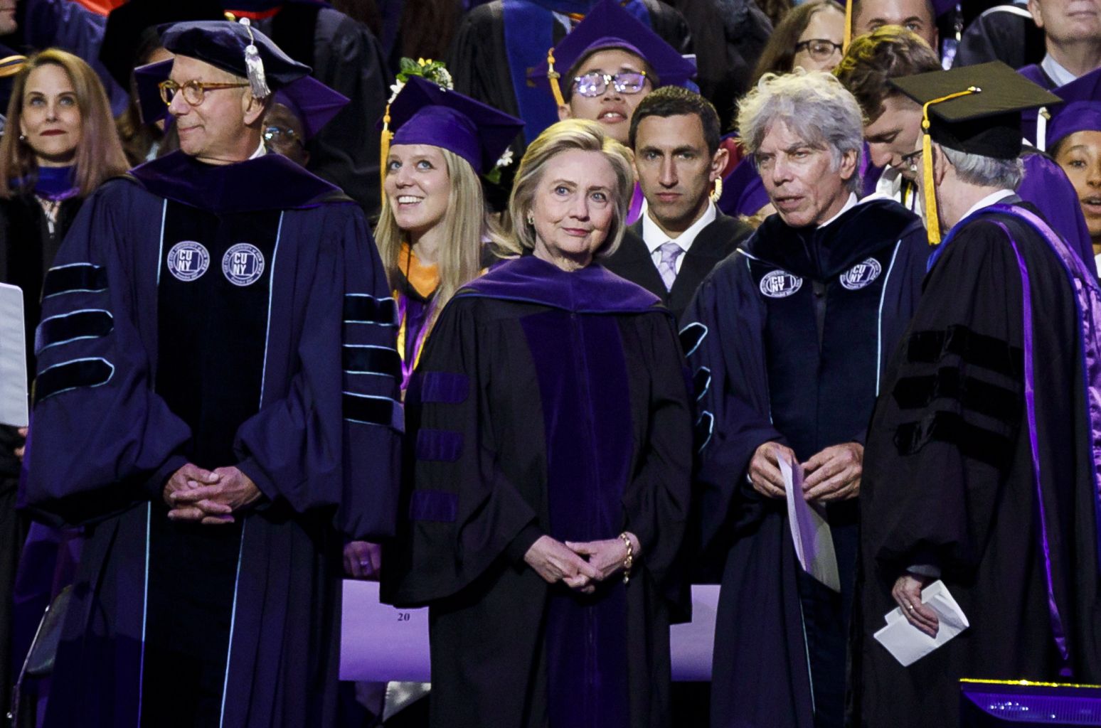 Clinton (centre) attending Hunter College's commencement ceremonies at Madison Square Garden in New York, May 29, 2019.