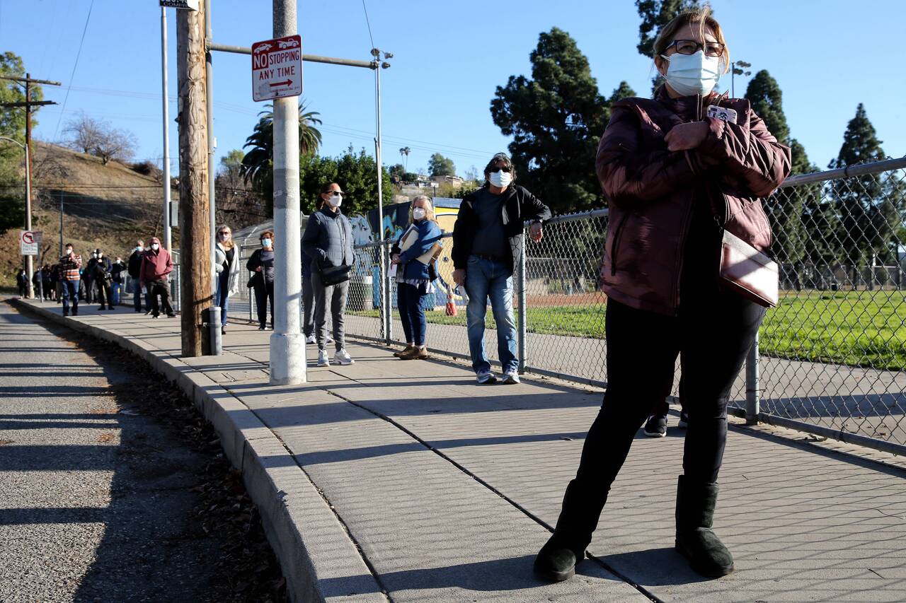 People wait in line to receive the Covid-19 vaccine at a walk-up public health vaccination site in Los Angeles, on Jan 26, 2021.