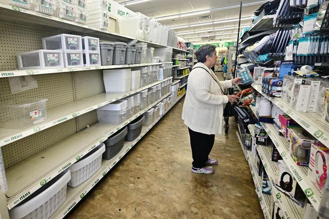 Empty shelves are seen as a woman shops for items at a Dollar Tree store on April 28 in Alhambra, California.