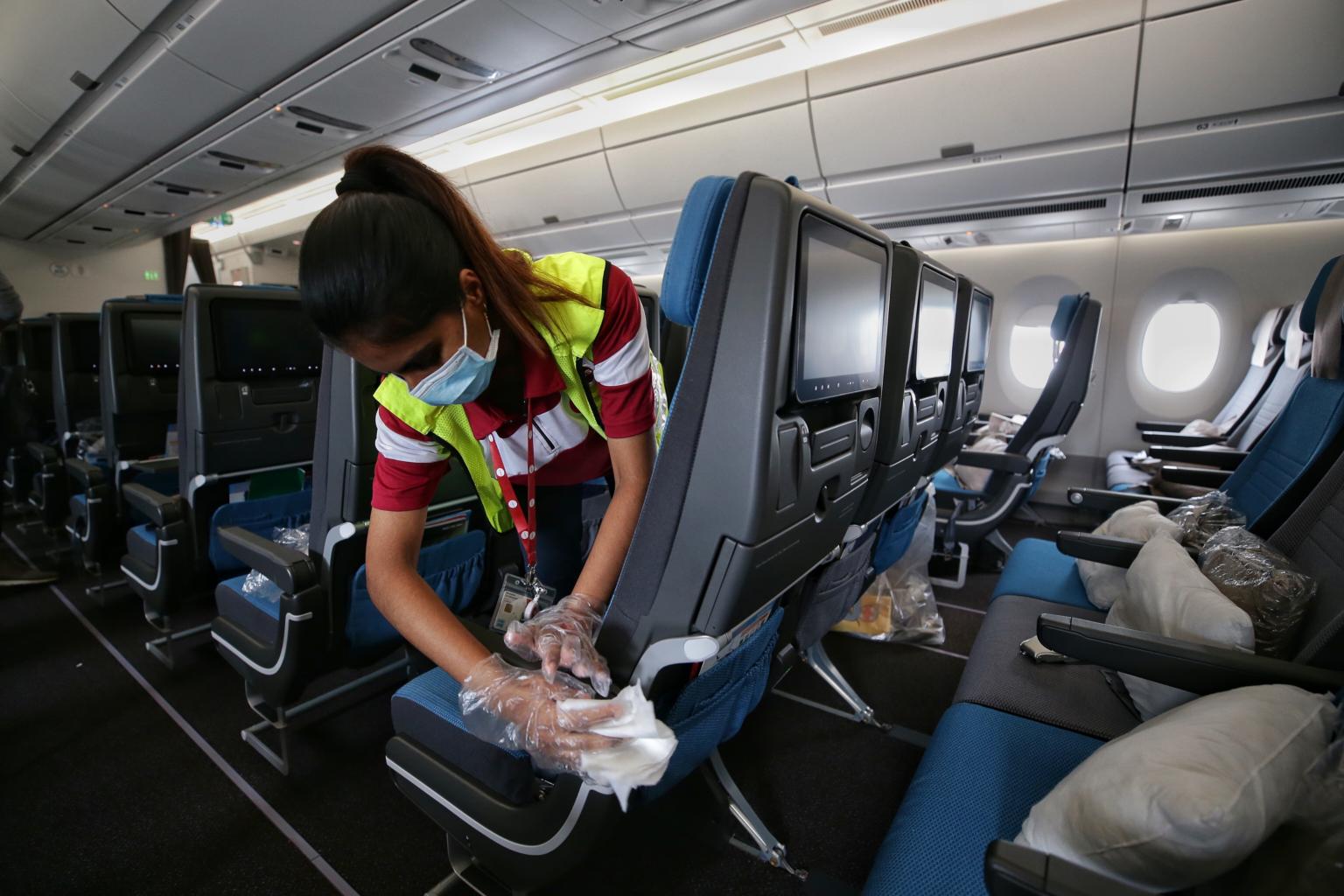 A staff from SATS’ Aircraft Interior Cleaning cleaning common surface areas in a SIA aircraft on Feb 21, 2020.