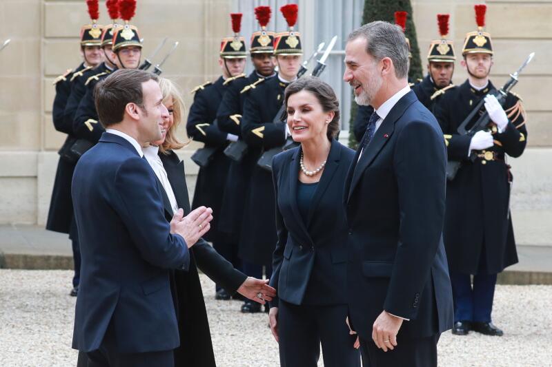 French President Emmanuel Macron (left) greeted Spain’s King Felipe VI and Queen Letizia by replacing the traditional handshake with an Indian-style namaste, pressing his palms together and bowing slightly, at the Elysee presidential Palace in Paris, on March 11, 2020.