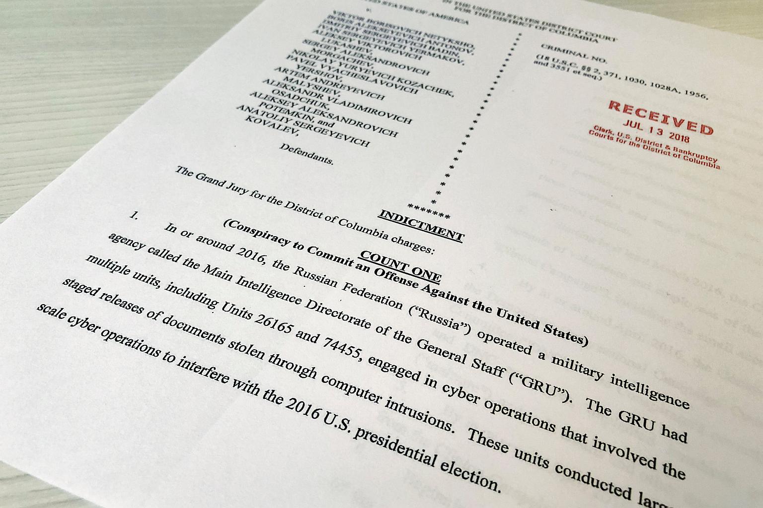 A copy of the grand jury indictment against 12 Russian intelligence officers is seen after the indictments were filed in US District Court by prosecutors working as part of special counsel Robert Mueller's Russia investigation in Washington, on July 13, 2018.