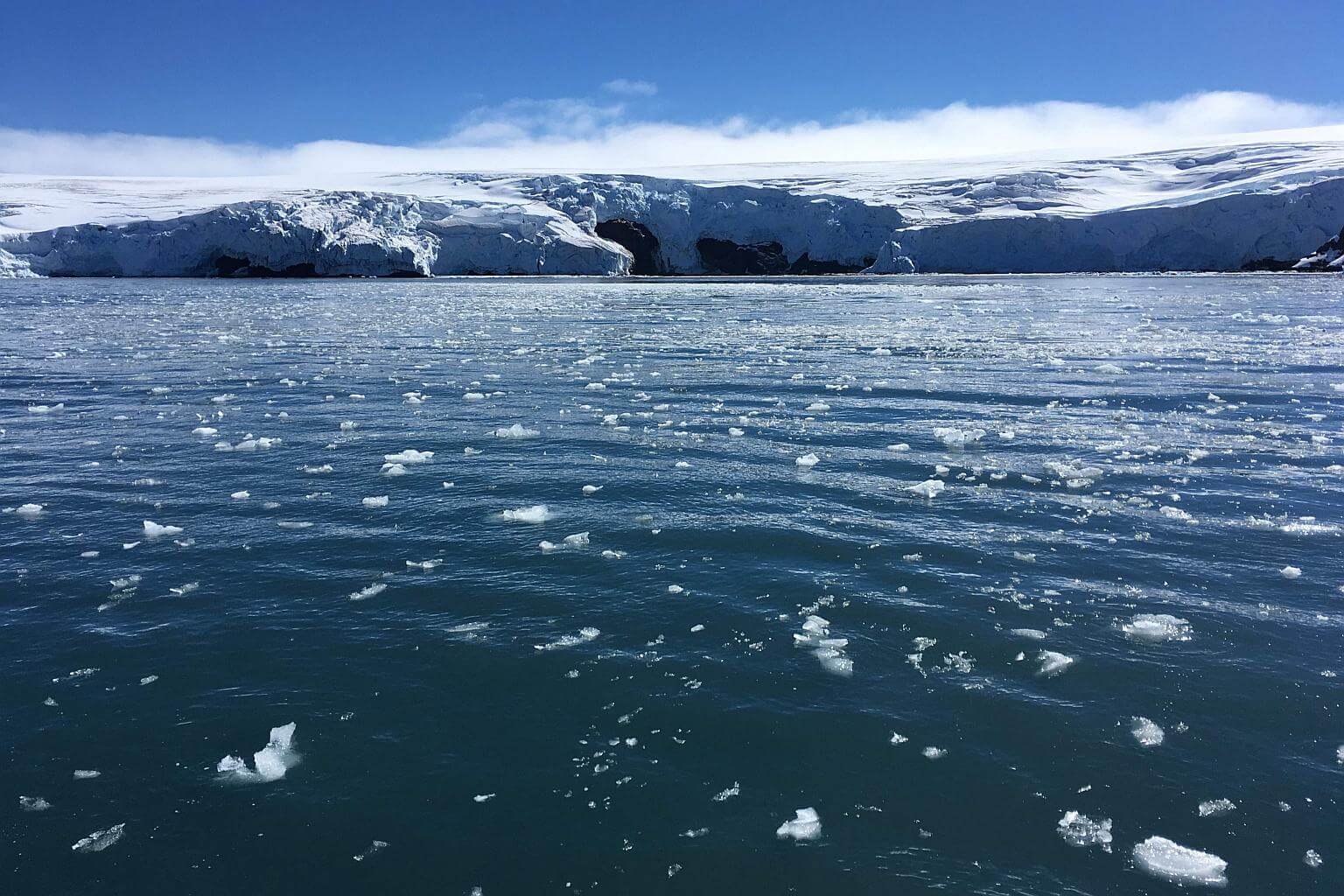 Blocks of ice drift on the water off the coast of Collins glacier on King George Island, Antarctica on Feb 1, 2018.