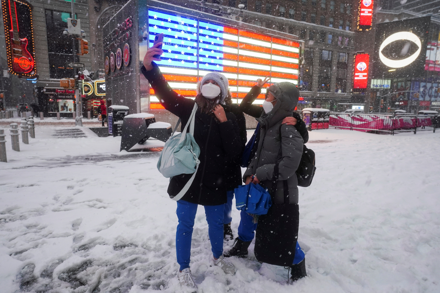 People take a selfie during a snowstorm in New York City, on Feb 1, 2021.