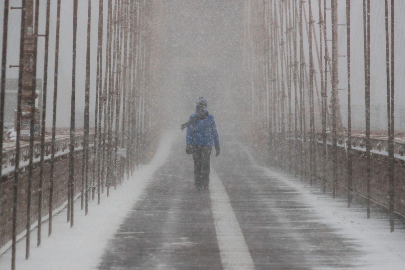 A person walks across the Brooklyn Bridge during a snowstorm, in New York City, on Feb 1, 2021.