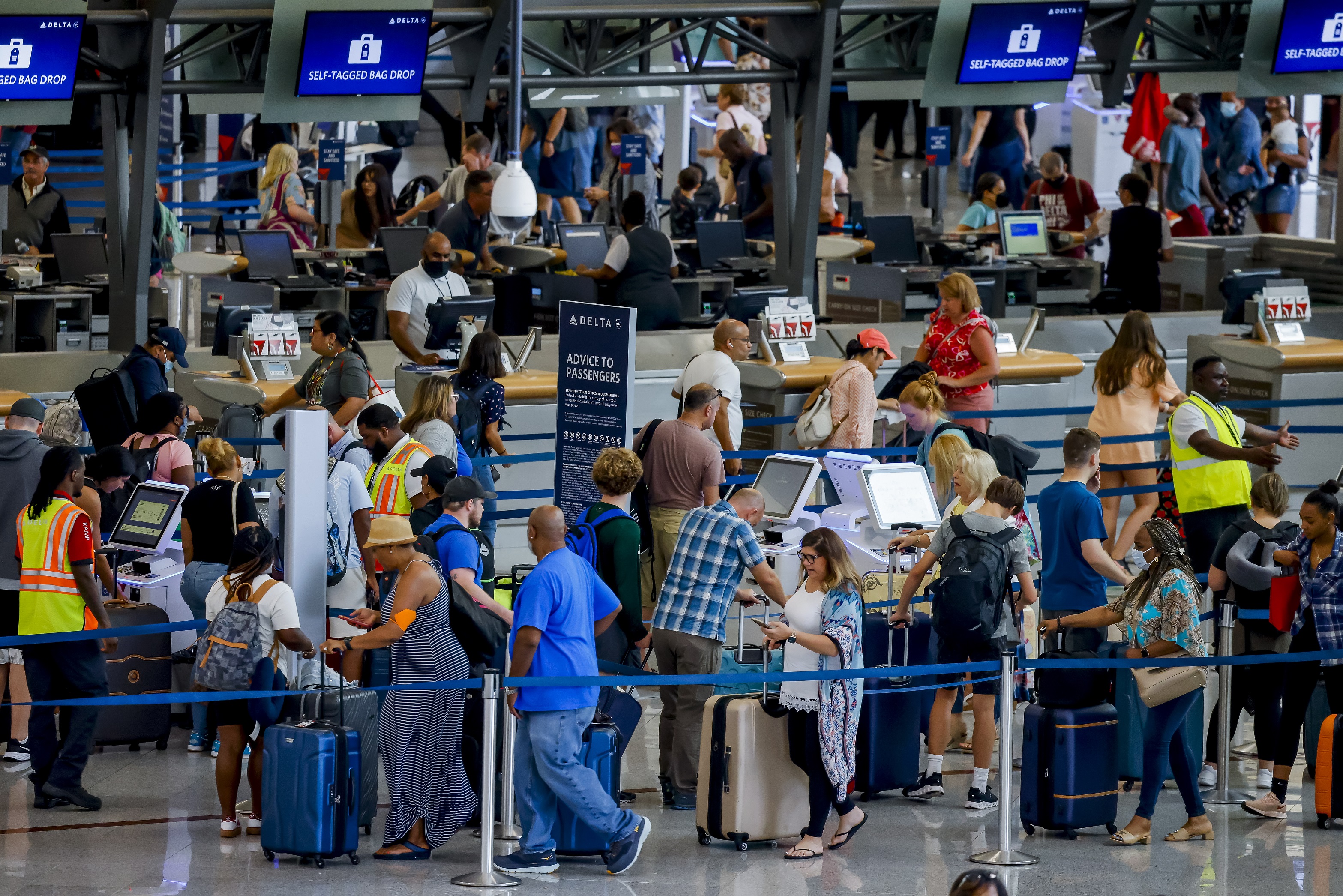 Air travellers check in for their flights at Atlanta's international airport in Georgia, on July 1, 2022.