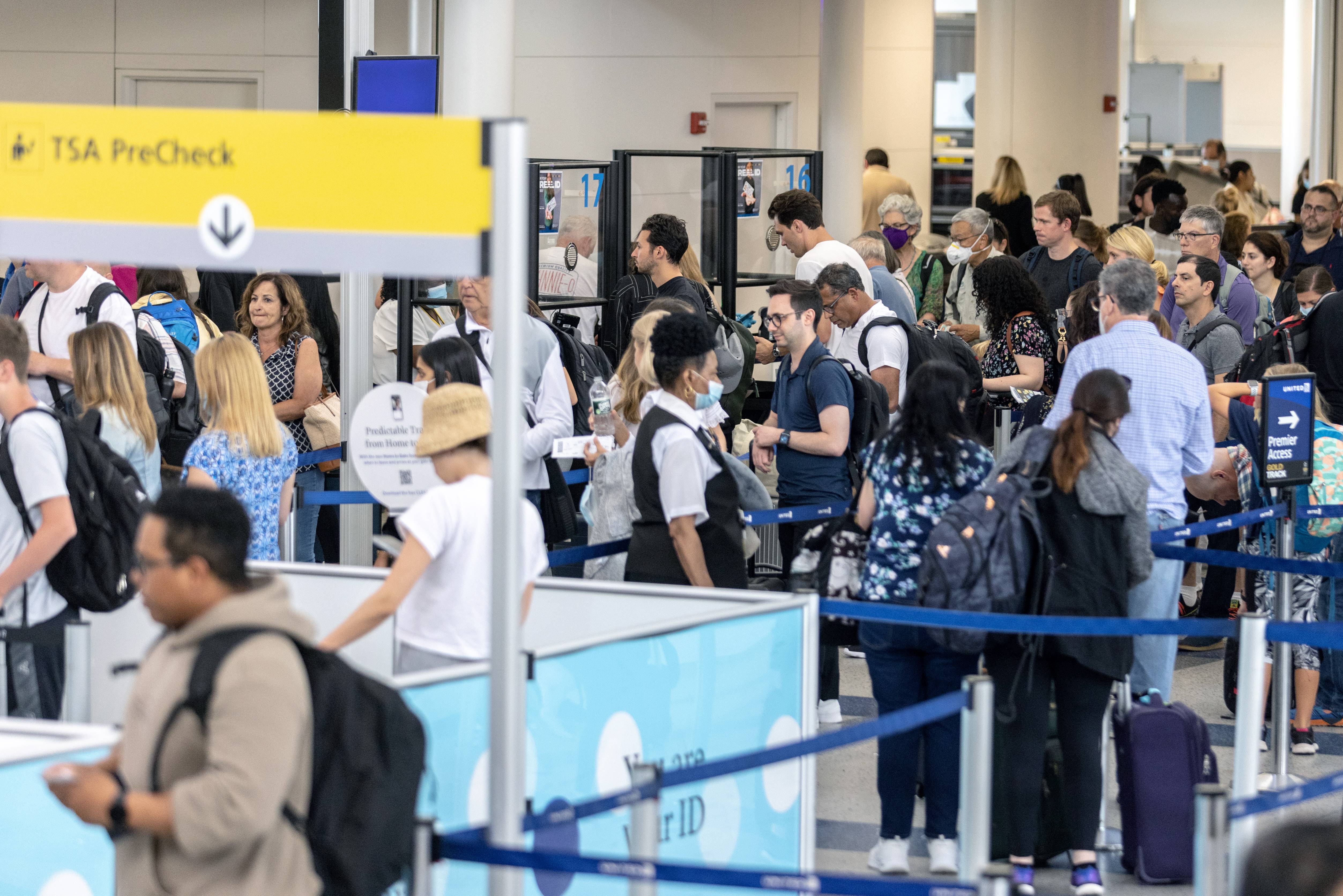 Travellers line up to enter a security checkpoint at Newark Liberty International Airport, in Newark, New Jersey, on July 1, 2022.