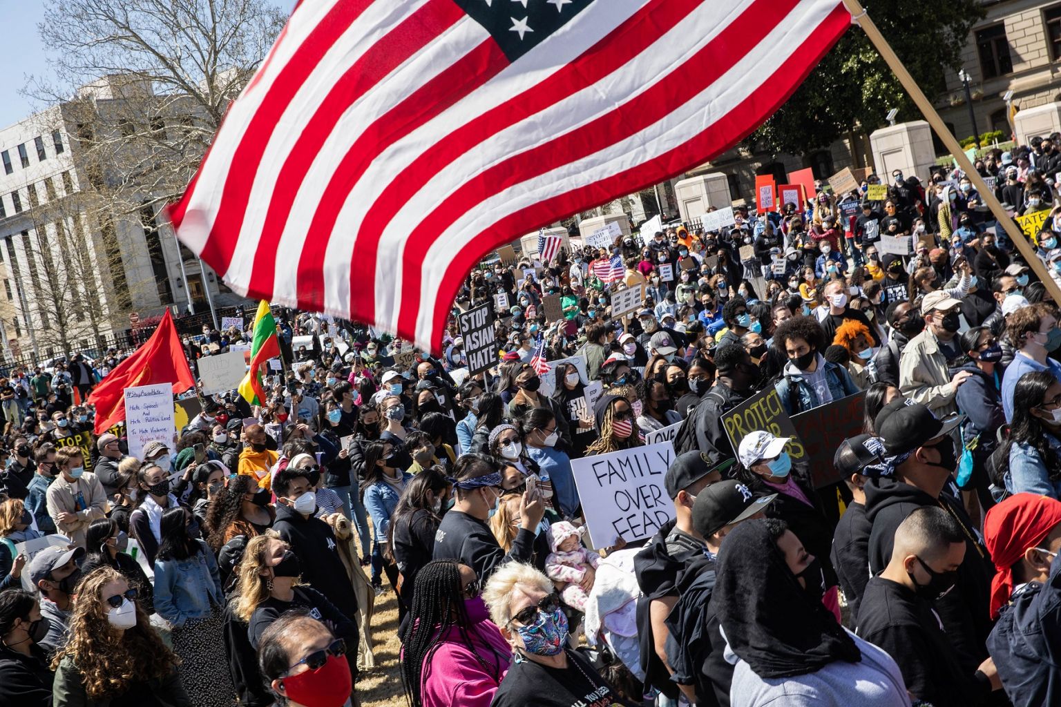 Crowds of people wearing masks, waving American flags and carrying posters that read "We are not the virus" and "Stop Asian Hate" stood in front of the golden-domed Georgia State Capitol building on Saturday.