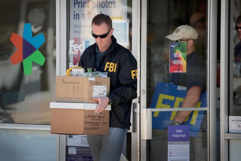 FBI agents collect evidence at a FedEx Office facility following an explosion at a nearby sorting center in Sunset Valley, Texas on March 20, 2018.