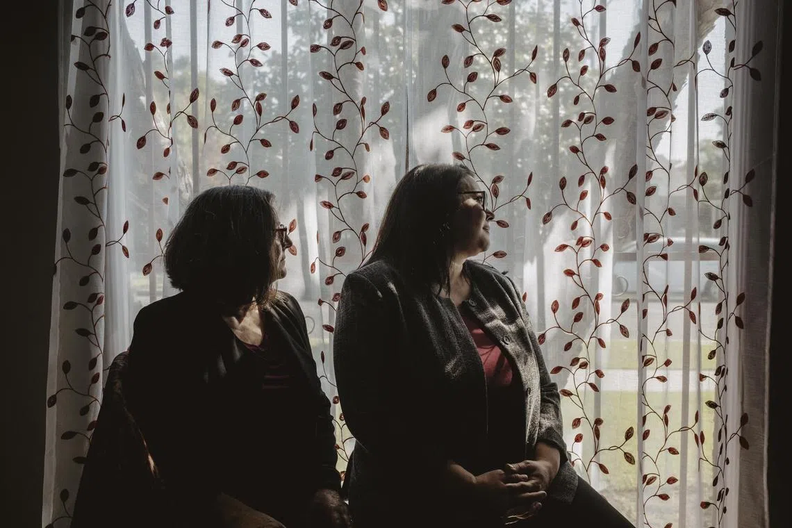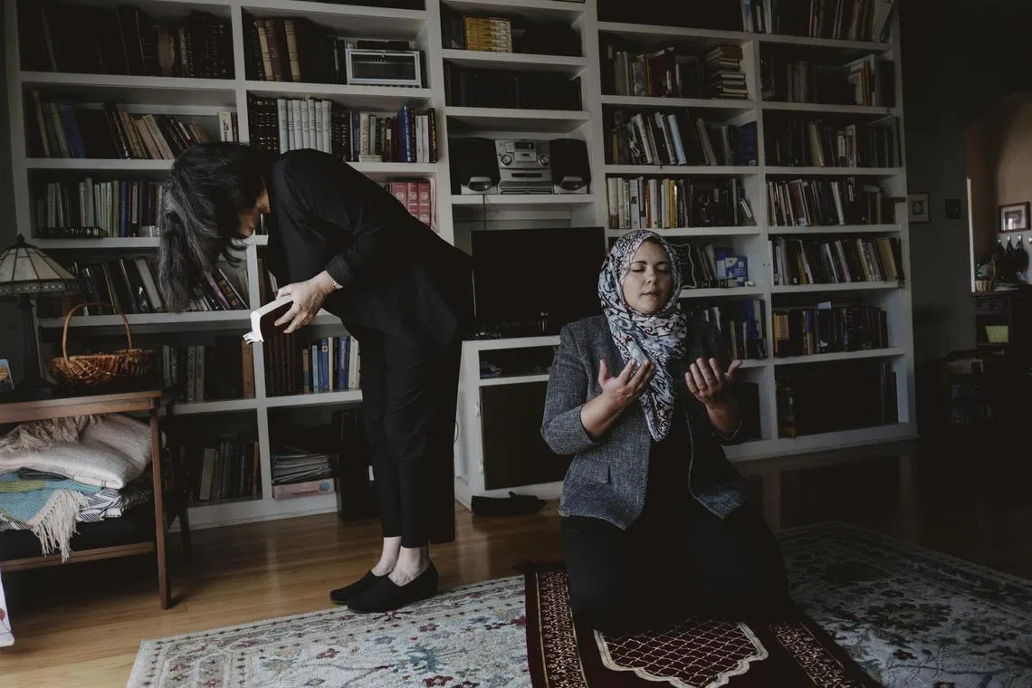 Ms Aziza Hasan (right) pauses for prayers while at the home of Ms Andrea Hodos, in Los Angeles, on Oct 19, 2023.