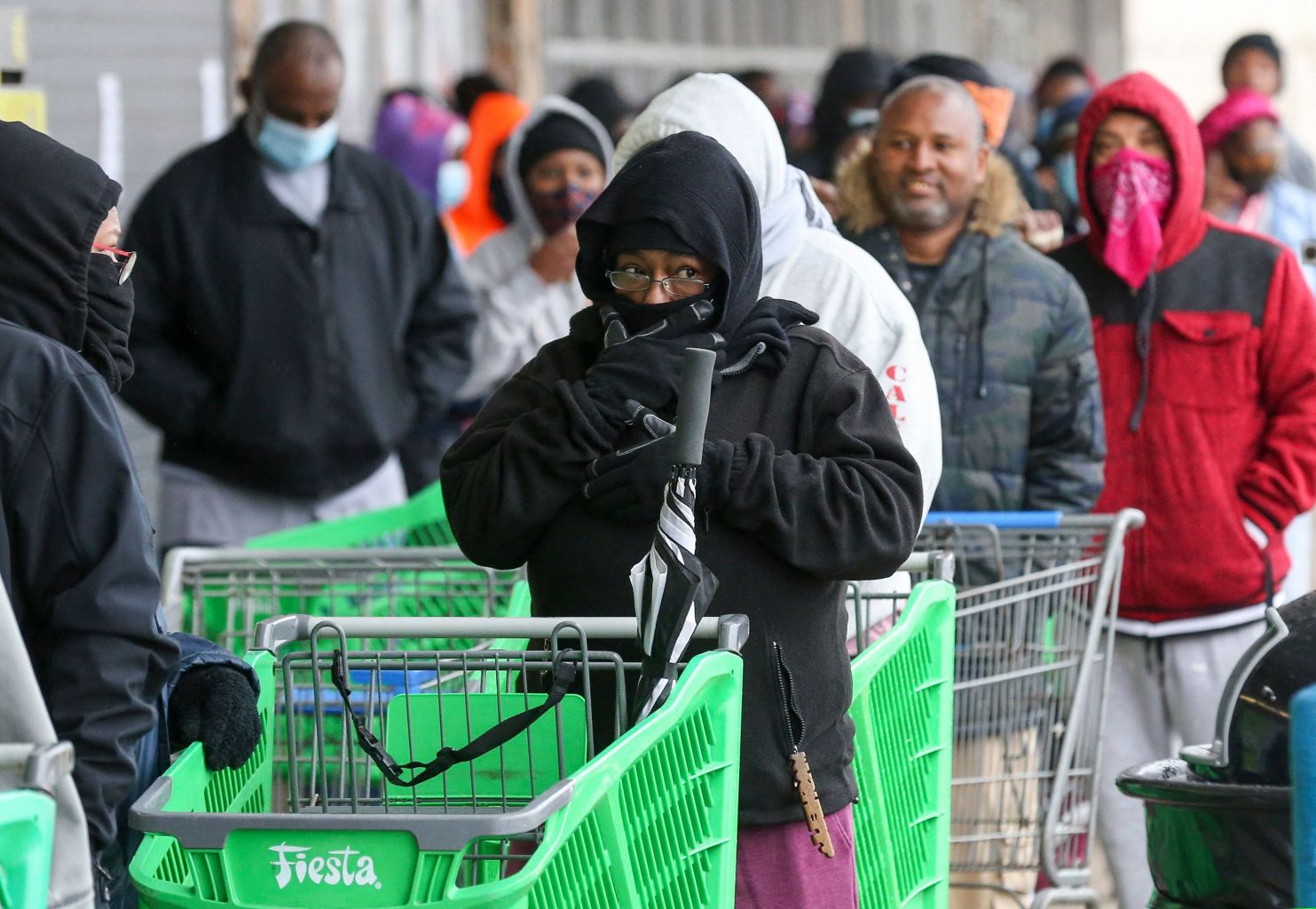 Customers wait in line to enter a Frontier Fiesta store in Houston, Texas, on Feb 17, 2021.