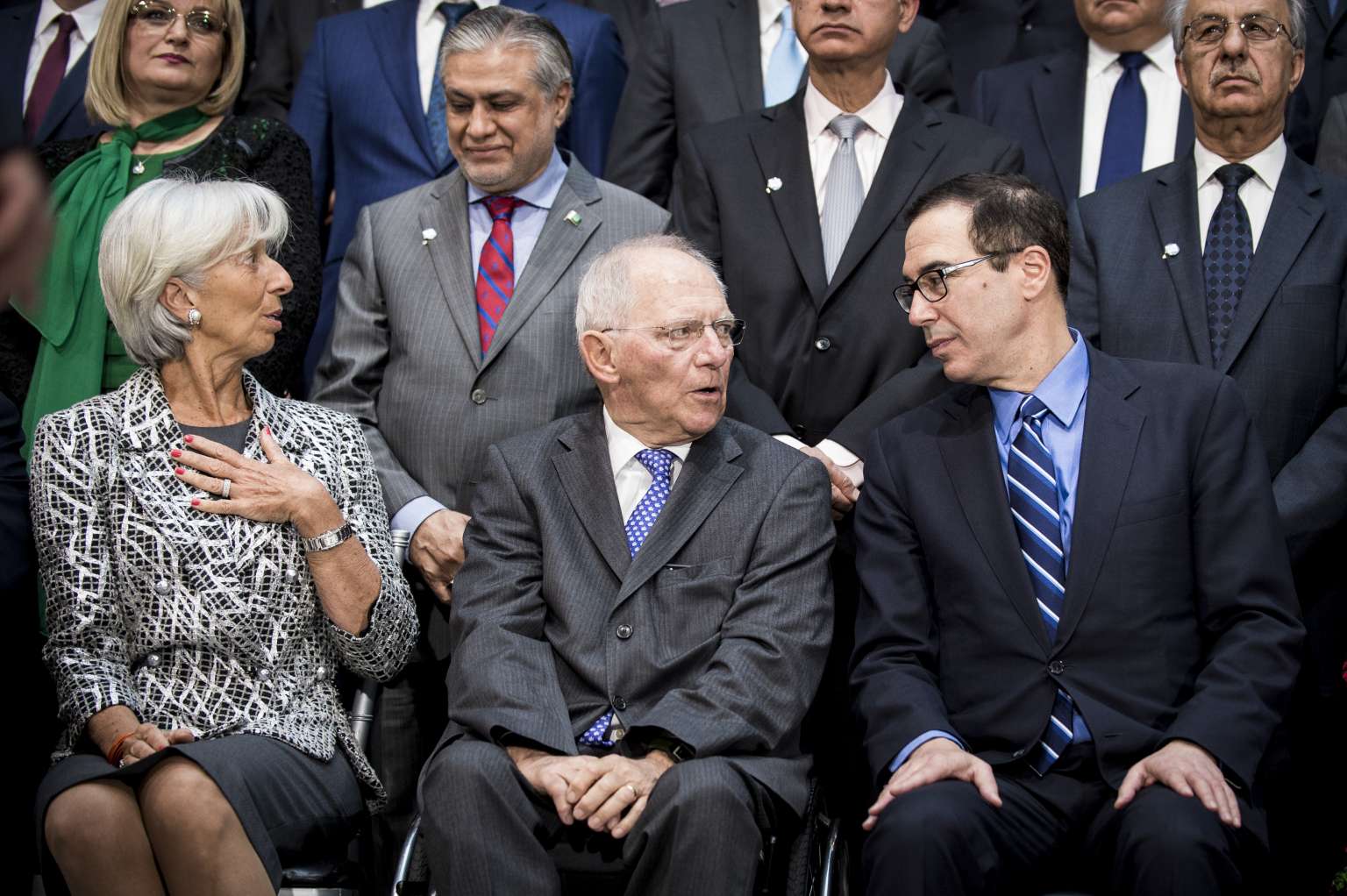(From left) IMF chief Christine Lagarde, German finance minister Wolfgang Schaeuble and US Treasury secretary Steven Mnuchin ahead of the group photo, April 22, 2017.