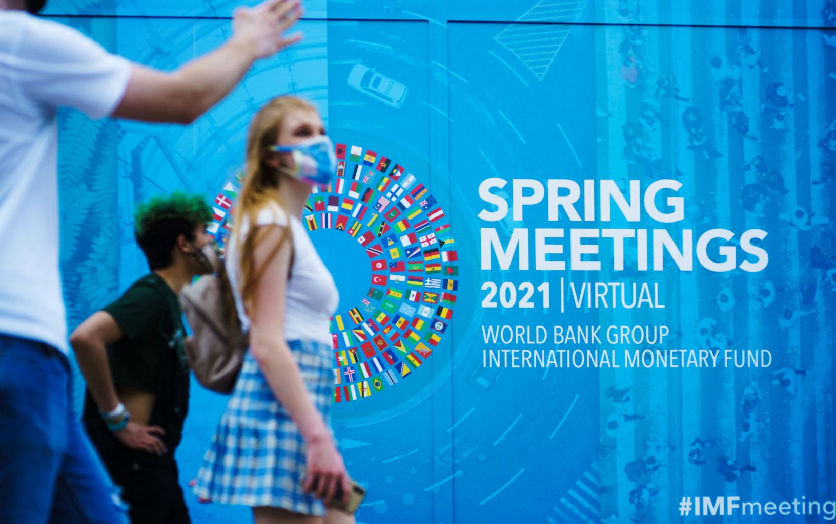 People pass by a banner for the World Bank Group/International Monetary Fund Virtual Spring Meetings in Washington, on April 7, 2021.