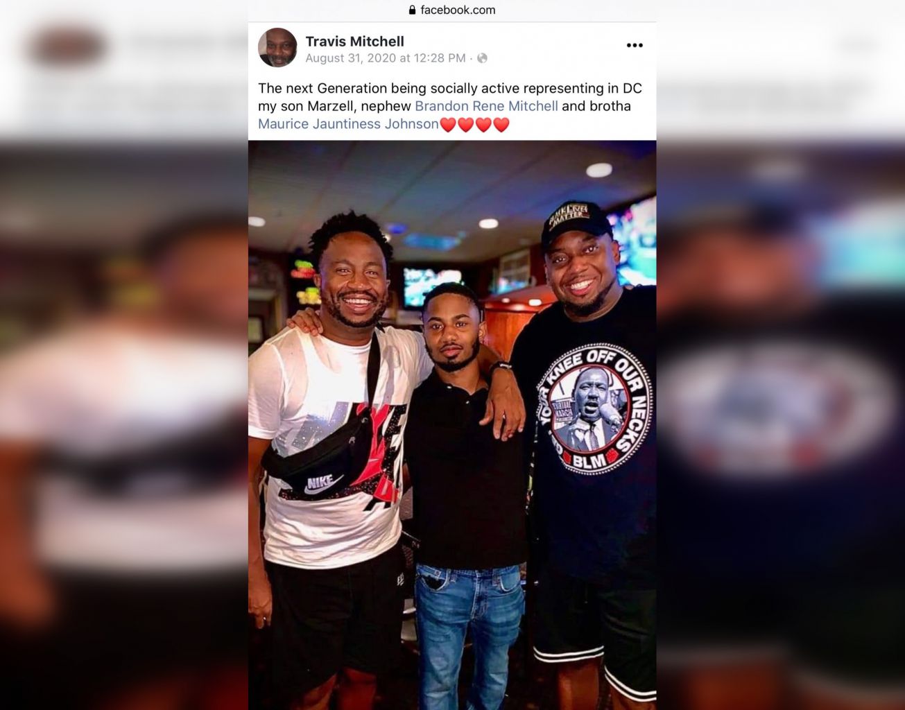 In the photo Mitchell, a Black 31-year-old, is wearing a T-shirt with a picture of civil rights leader Martin Luther King Jr on it and the words "Get Your Knee Off Our Necks" and the letters "BLM" for Black Lives Matter.