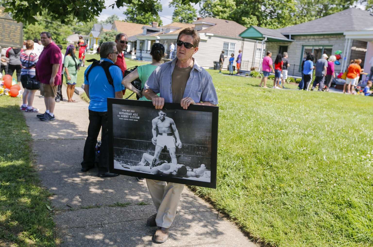 A man holds a poster outside the boyhood home of the late Muhammad Ali in Louisville, Kentucky on Sunday.