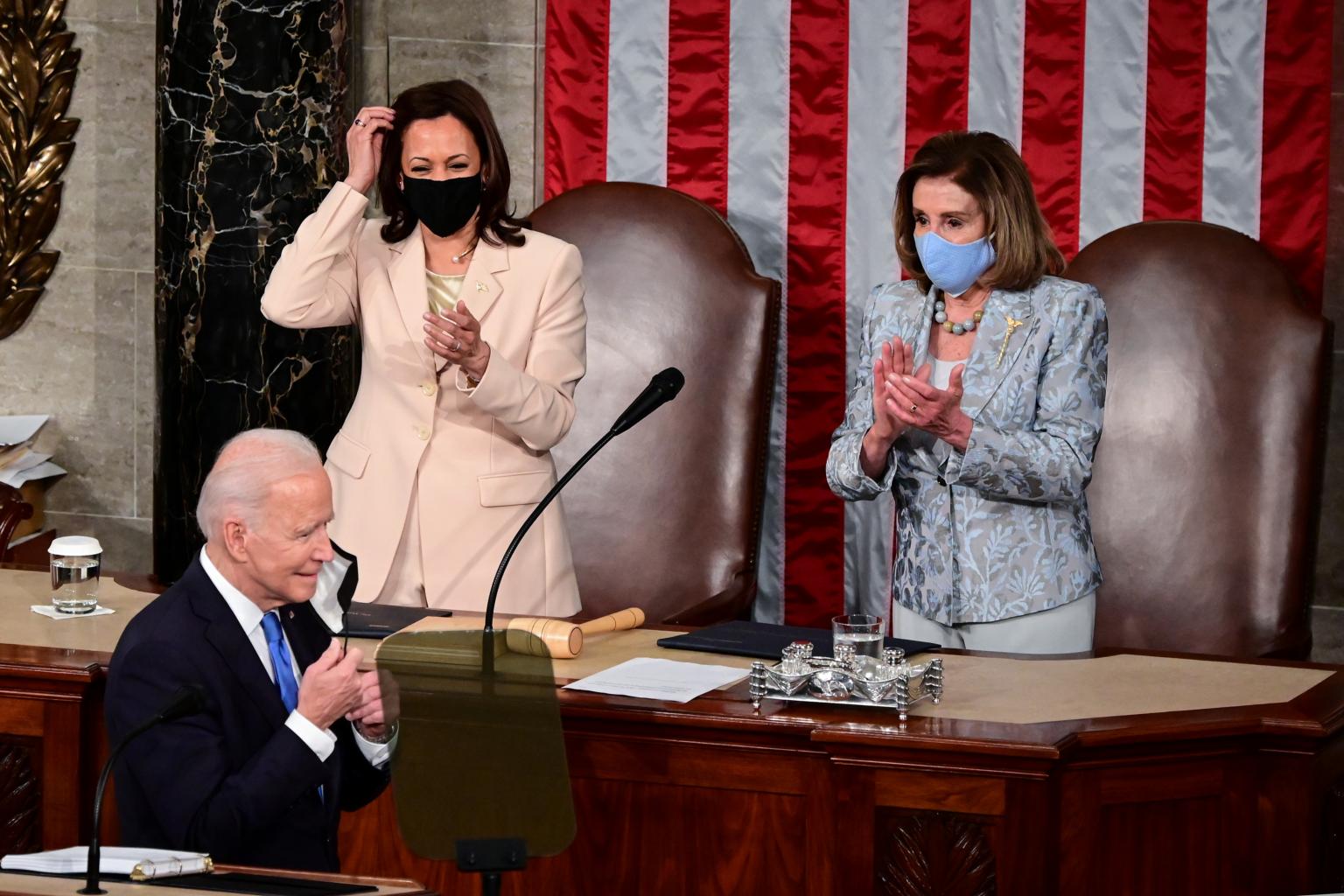 Harris, the first woman and the first Black and Asian person to serve as vice-president, sat to Mr Biden's right. Ms Pelosi, who became the first woman speaker of the House of Representatives in 2007, sat to his left.