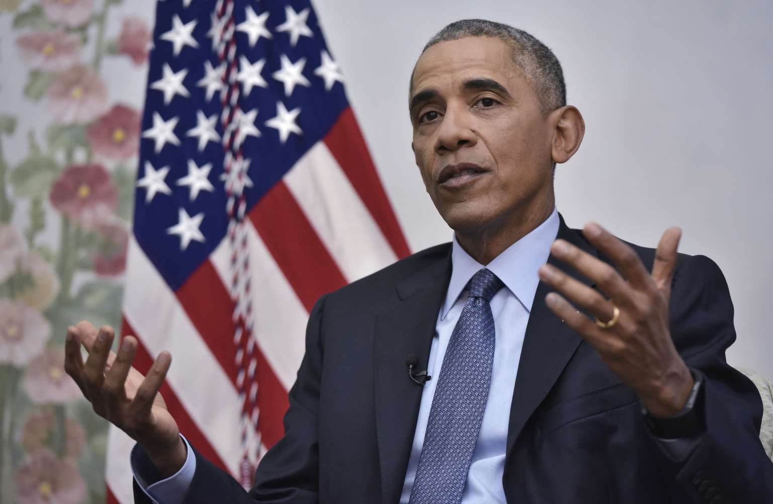 US President Barack Obama taking part in an interview with Vox’s Ezra Klein and Sarah Kliff in Blair House, on Jan 6, 2017, in Washington, DC.