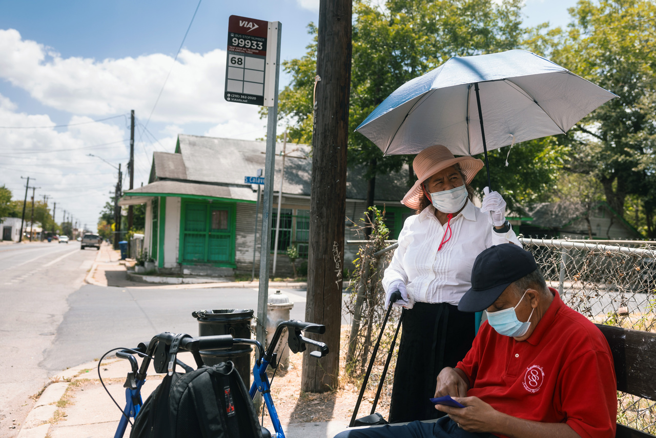 Ms Amelia and and Mr Antonio Castillo wait at a bus stop with no roof in San Antonio, Texas on July 22, 2022.