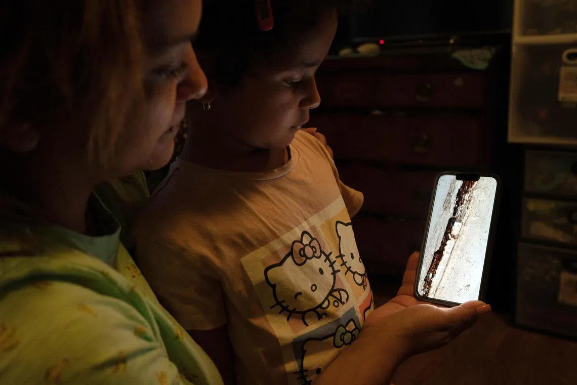 Ms Luisa Rodriguez’s daughter Dara watching a show as she rested her feet on plastic storage bins that the family uses to protect their belongings from mould.