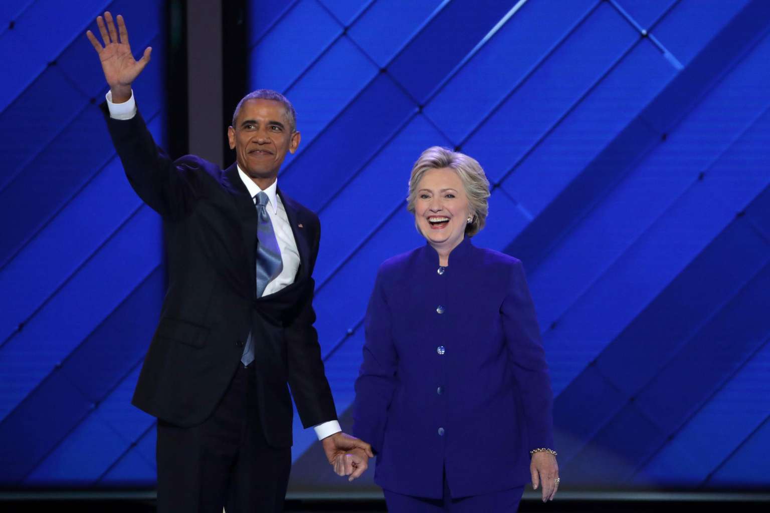 US President Barack Obama and Democratic presidential nominee Hillary Clinton acknowledge the crowd on the third day of the Democratic National Convention at the Wells Fargo Center on July 27 in Philadelphia, Pennsylvania.
