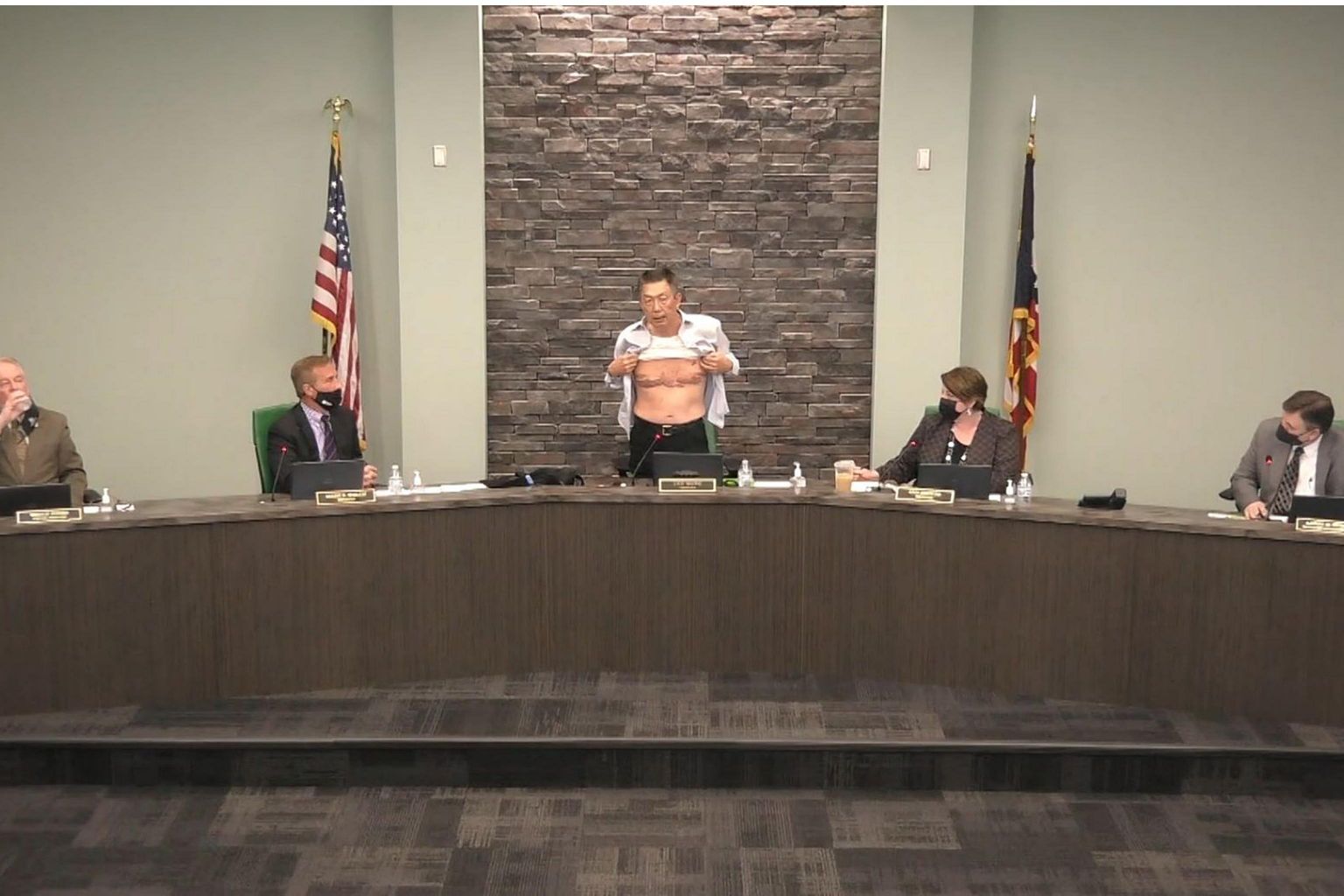 Mr Wong removed his suit jacket and his tie and unbuttoned his dress shirt, according to a video of the board's March 23 meeting, which has since drawn widespread attention.