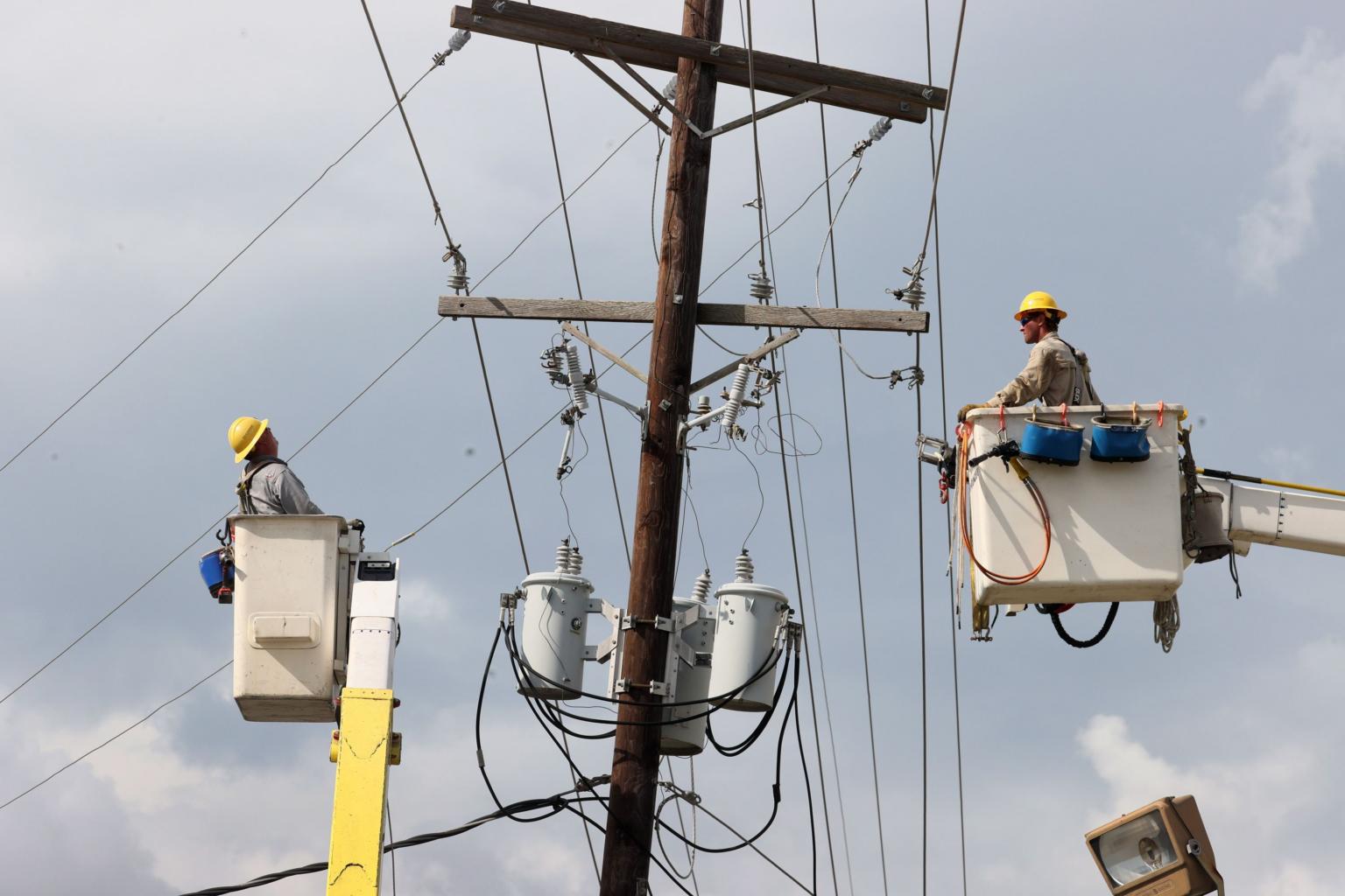Workers repair power lines damaged by Hurricane Ida in Houma, Louisiana, on Aug 31, 2021.