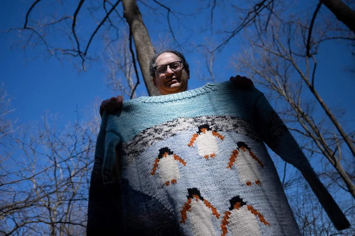 Mr Sam Barsky, whose professional knitting led to him becoming a social media influencer, poses with a penguin sweater.