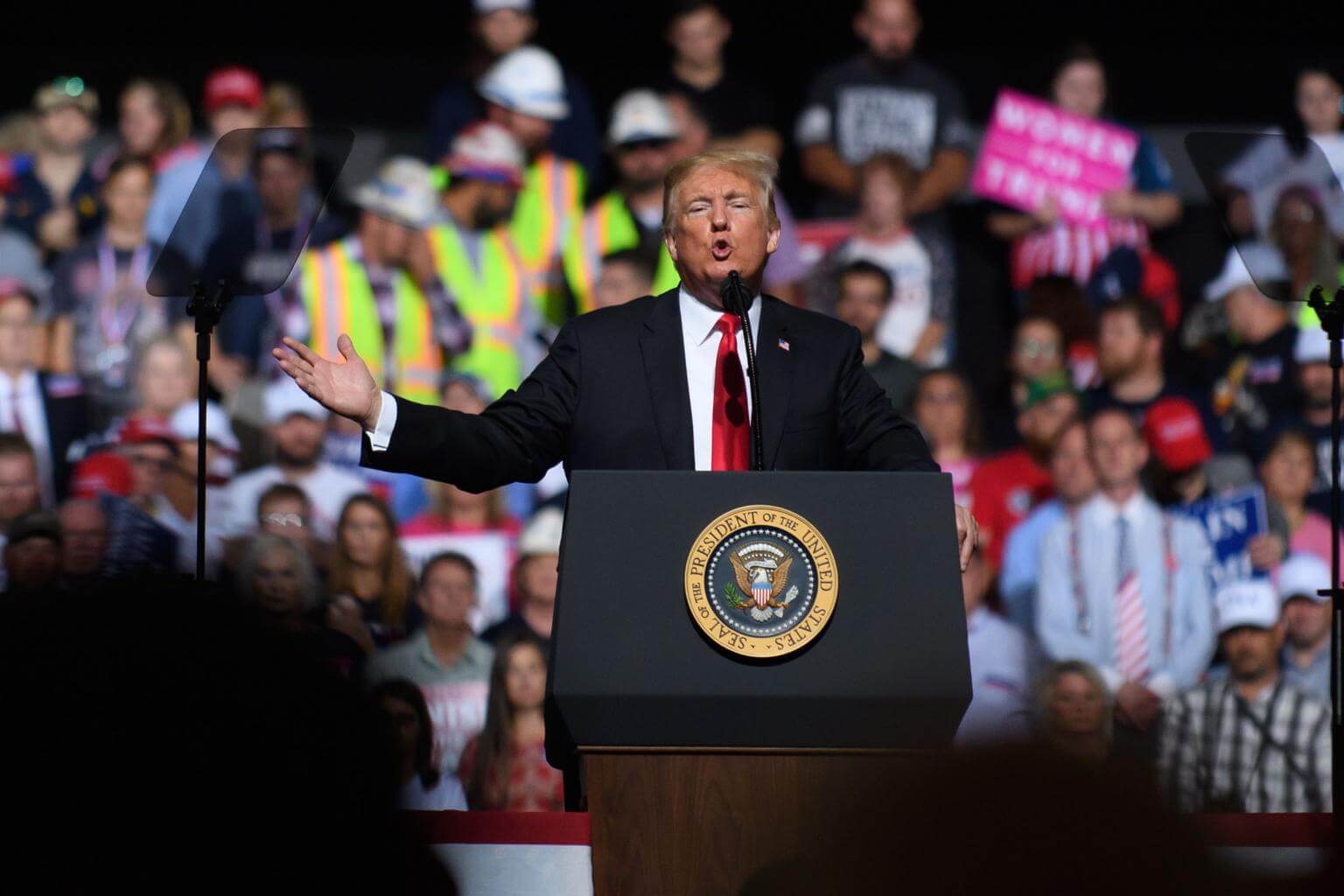 US President Donald Trump speaks to supporters at his rally inside the WesBanco Arena, in Wheeling, West Virginia, on Sept 29, 2018.
