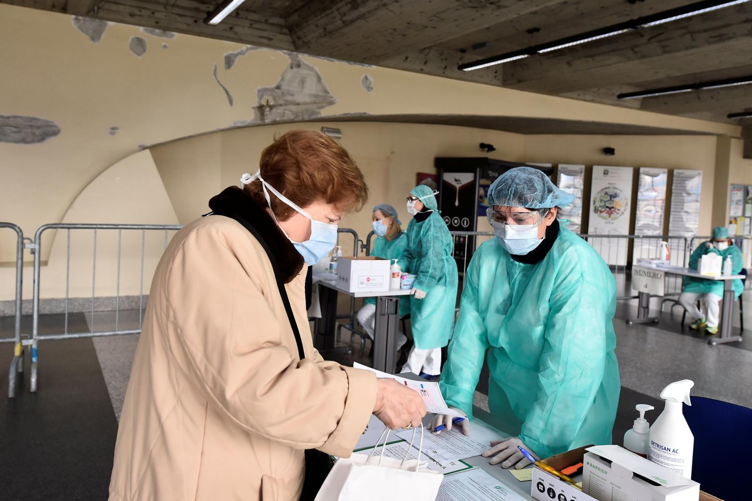 Medical workers wearing protective masks check patients at a medical checkpoint at the entrance of the Spedali Civili hospital in Brescia, Italy, on March 3, 2020.
