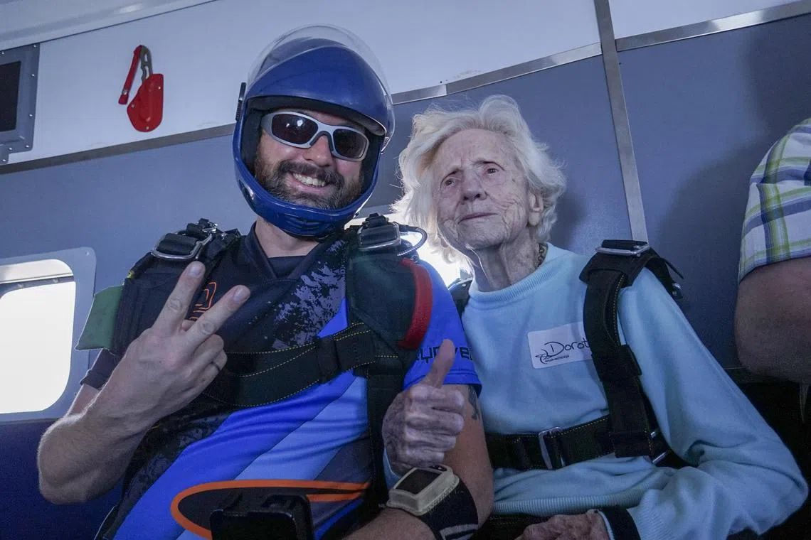 Ms Dorothy Hoffner, 104, with instructor Derek Baxter just before a skydive in Ottawa, Illinois, on Oct 1, 2023.