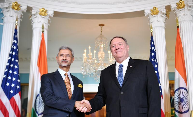 US Secretary of State Mike Pompeo (right) poses for a photo with Indian Foreign Minister Subrahmanyam Jaishankar ahead of a meeting at the State Department in Washington, DC on Sept 30, 2019.