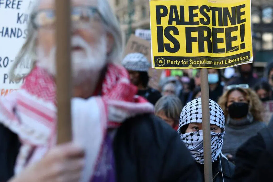 Pro-Palestinian protestors rallying in Lower Manhattan, New York City on March 10.
