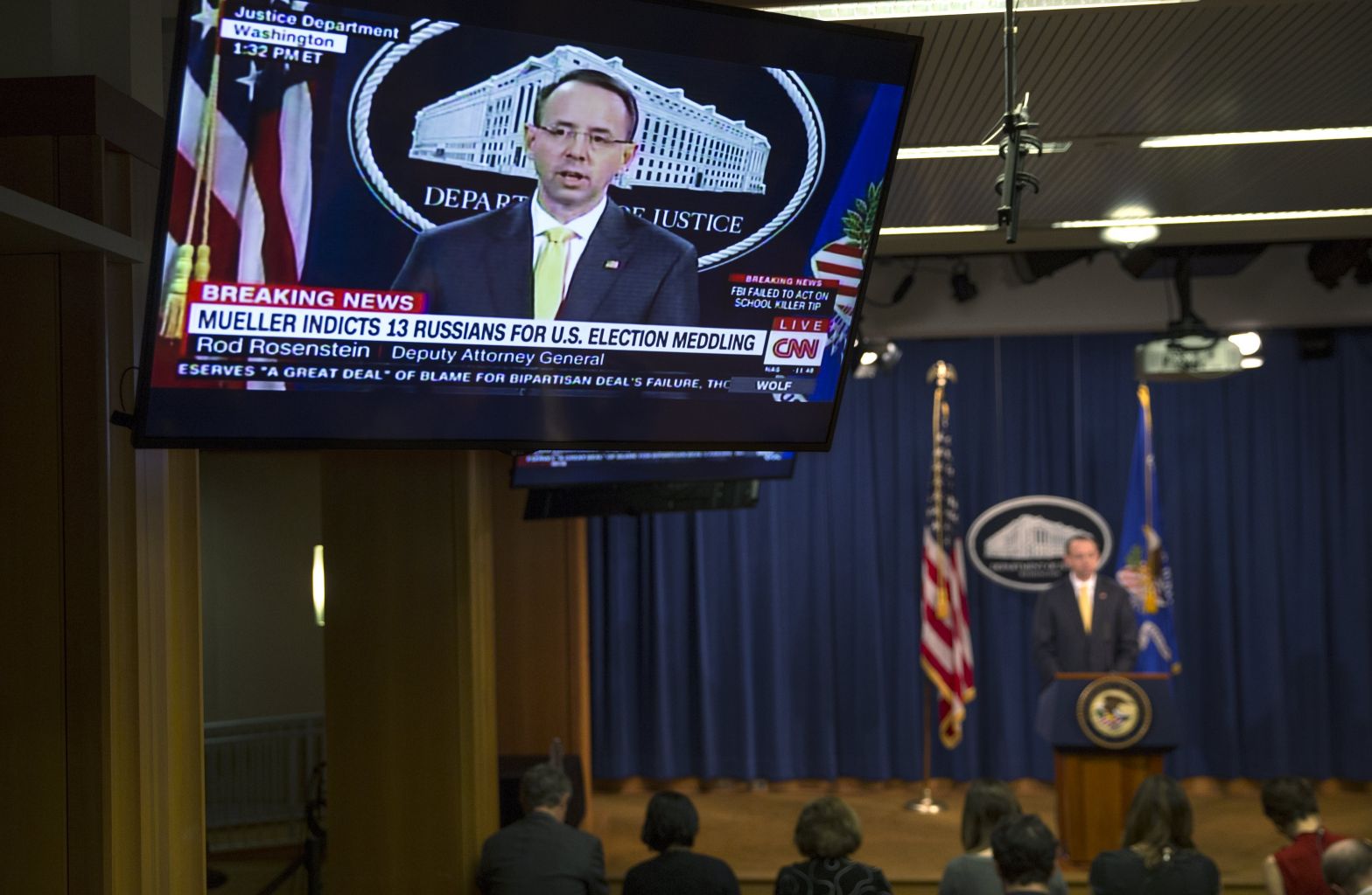 Deputy Attorney General Rod Rosenstein announces the indictment of 13 Russian nationals and 3 Russian entities for violating criminal laws with an elaborate conspiracy at the Department of Justice headquarters in Washington on Feb 16, 2018.