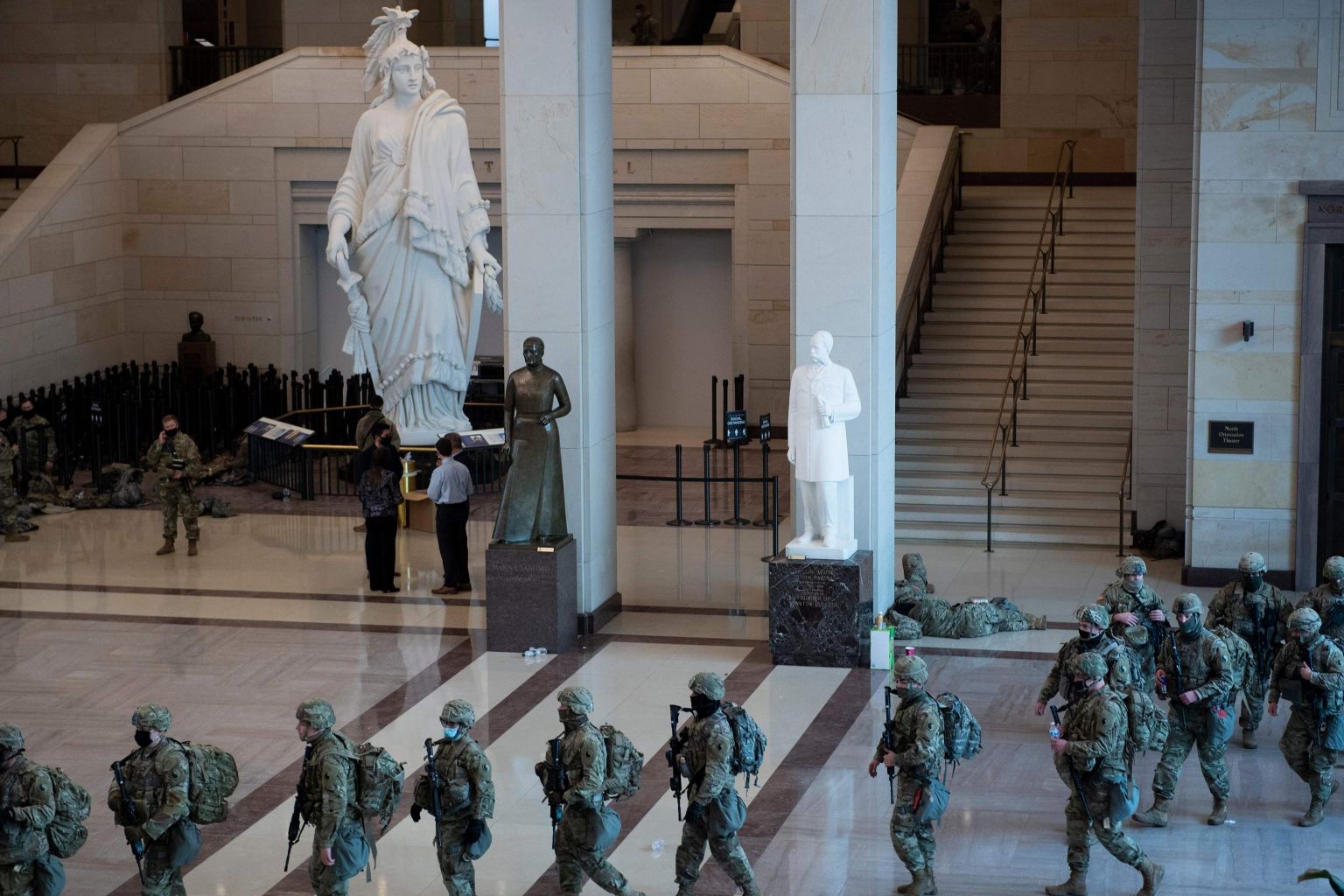 Their colleagues in another room could be seen dozing next to a plaque commemorating the Union troops who were quartered in the Capitol in 1861, in Statuary Hall, and a small group of soldiers posed for a photo with the statue of Rosa Parks.