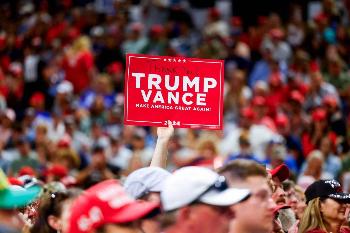 A supporter holds up a sign at a rally at the Brick Breeden Fieldhouse at Montana State University on Aug 9, 2024.