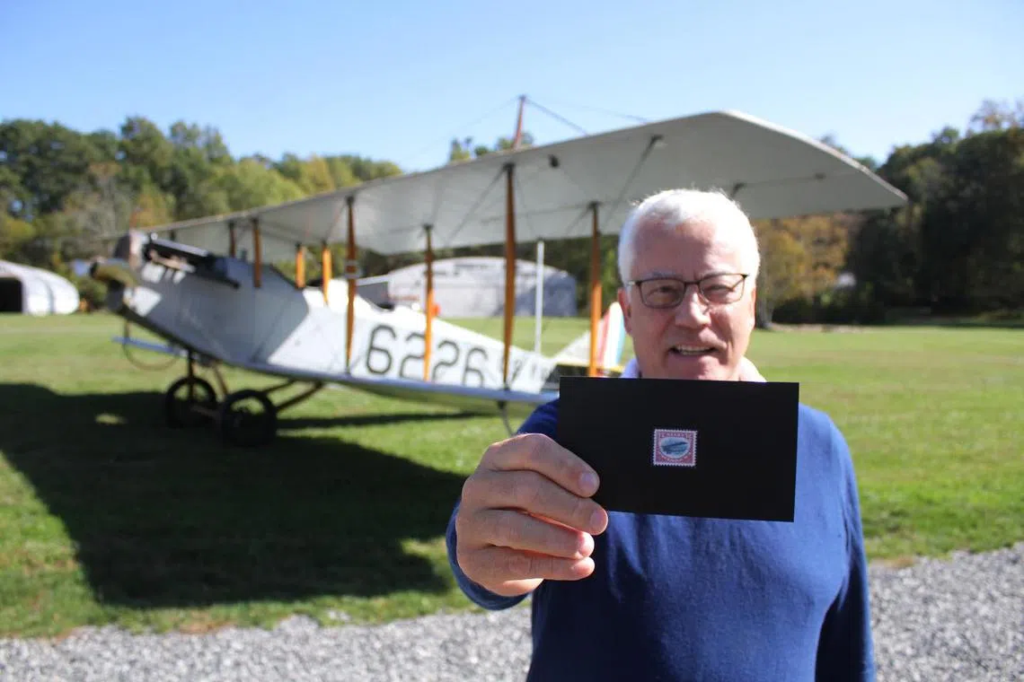 Mr Scott Trepel, president of the Robert A. Siegel Auction Galleries, with an Inverted Jenny stamp in front of a Curtiss JN-4H “Jenny” biplane.
