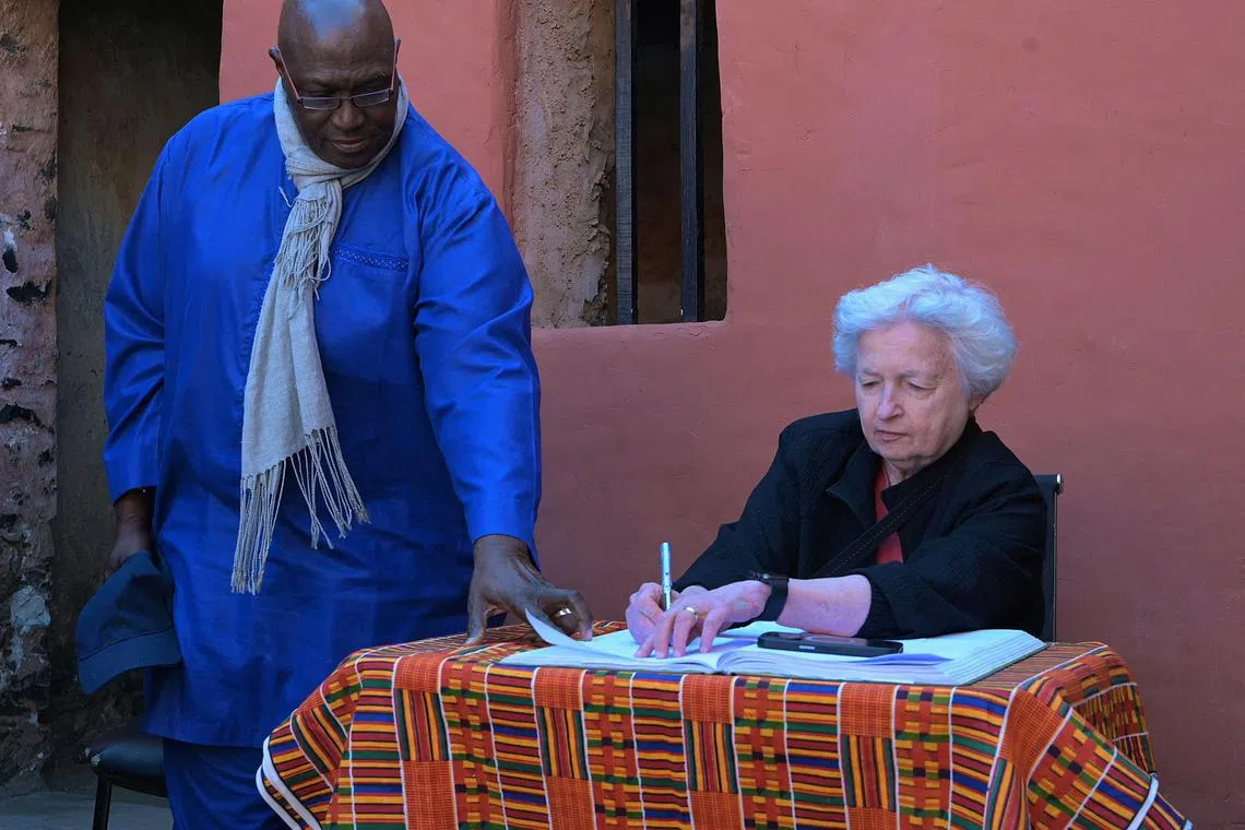 US Treasury Secretary Janet Yellen, flanked by curator Eloi Coly, signs the guestbook at the House of Slaves.